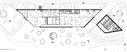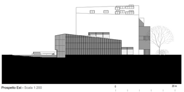 La biblioteca è costituita da due corpi che sono separati fuori terra ma uniti a livello del piano interrato.